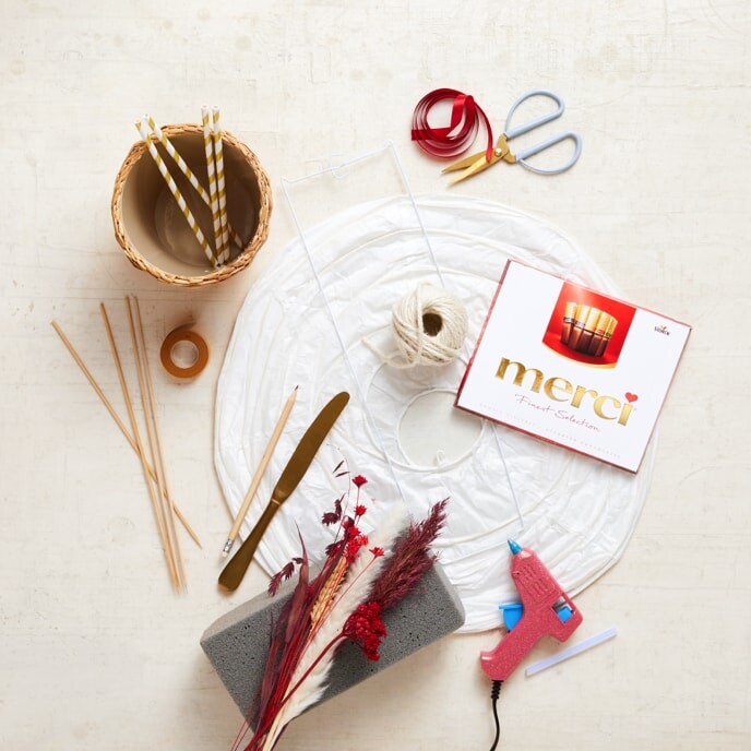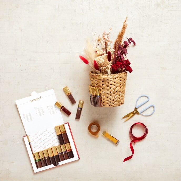 Klebe das doppelseitige Klebeband um den Korb und befestige die merci daran. Binde noch ein Geschenkband drum herum, damit sie gut halten.