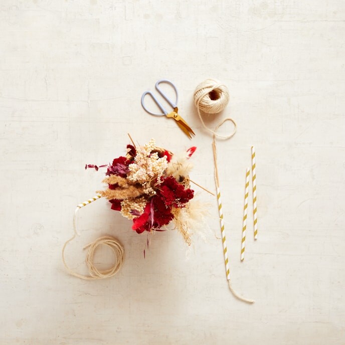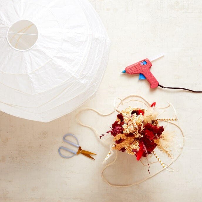 Platziere den Lampion auf die Schaschlikspiesse und binde ihn mit der Kordel fest. Führe dafür die Kordel über den Lampion und durch die Strohhalme. Und fertig ist Dein eleganter Heissluftballon!
