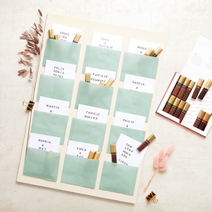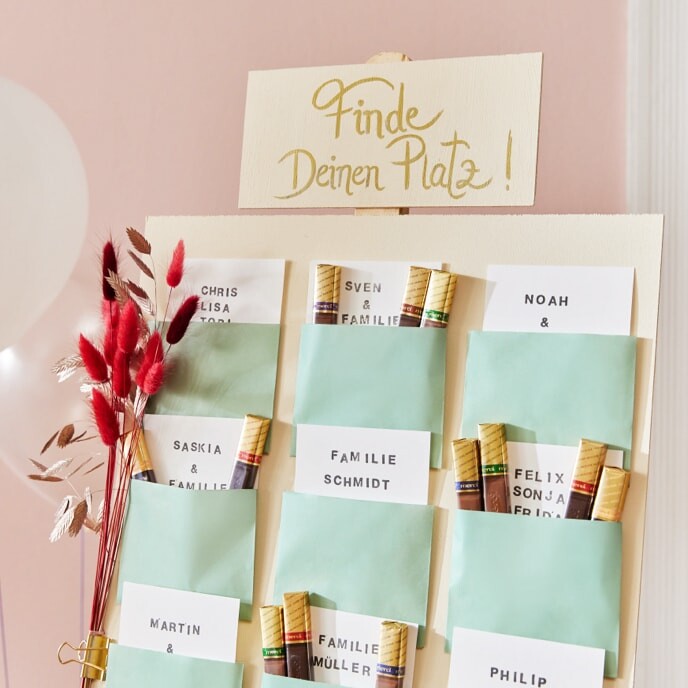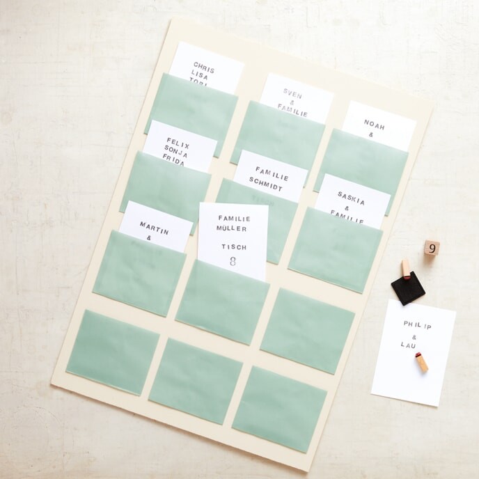 Stemple Namen und Tischnummern auf die Karten und stecke sie in die Umschläge.