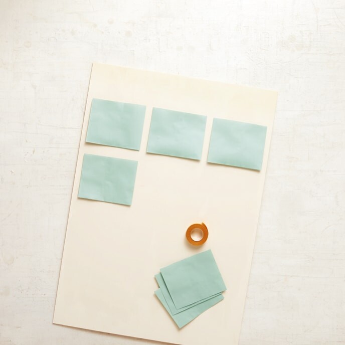 Befestige die Umschläge in regelmässigen Abständen mit doppelseitigem Klebeband auf der Platte.
