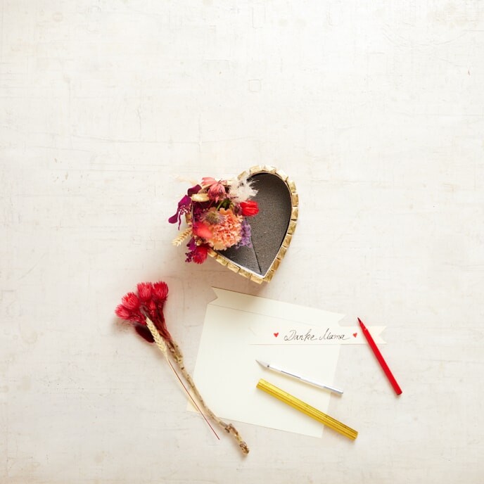 Schneide die Blumen zurecht und stecke sie in die Steckmasse. Schneide aus dem Fotokarton ein Schild und beschrifte es mit einer lieben Botschaft.