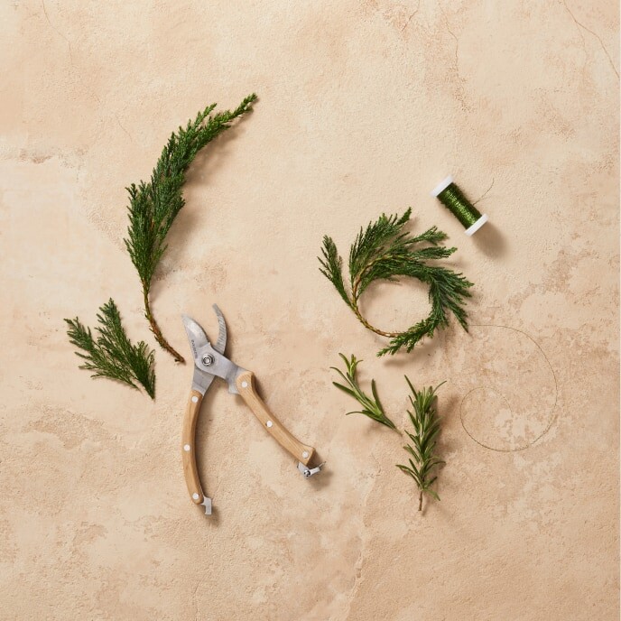 Nimm dir nun einen Zweig und entferne die unteren Nadeln. Wickle mit Hilfe des Drahtes die beiden Enden des Zweigs zusammen, sodass ein Kranz entsteht. Verziere diesen noch mit etwas Rosmarin – für eine Extraportion herrlichen Duft.