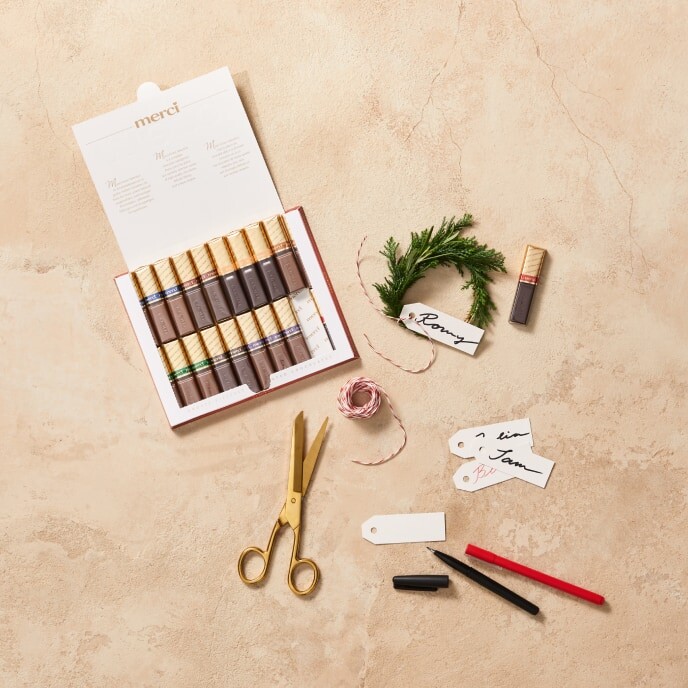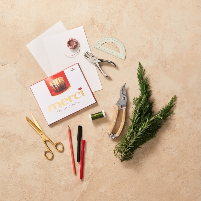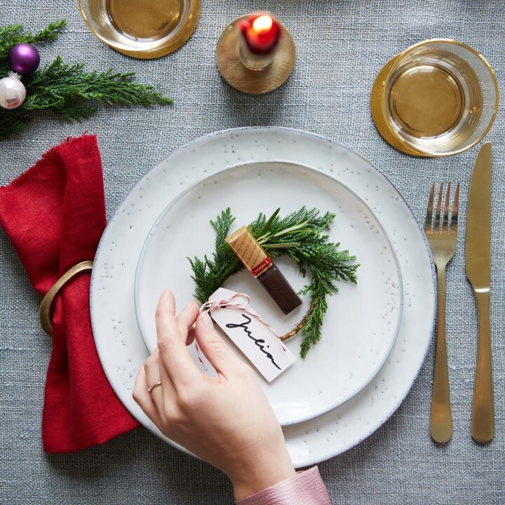 Beschrifte die Anhänger mit den Namen Deiner Gäste oder einer Grussbotschaft. Binde sie dann mit einem Stück Kordel an den Kranz und lege ein merci Stäbchen mittig dazu. Jetzt können Deine Gäste Platz nehmen.
