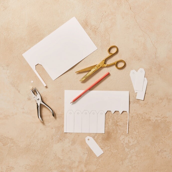 Zeichne Dir zuerst eine Schablone für Deine Anhänger auf das Papier und schneide sie aus. Vergiss das Loch nicht. Übertrage die Schablone dann auf Deinen ausgewählten Fotokarton, schneide die Anhänger aus und loche sie.