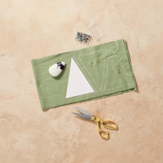 Lege den Stoff doppelt (rechts auf rechts) und fixiere ihn mit den Stecknadeln, damit Dir beim Schneiden nichts verrutscht. Übertrage dann mit Hilfe der Stoffkreide die Schablone auf Deinen Stoff und schneide die Dreiecke aus.