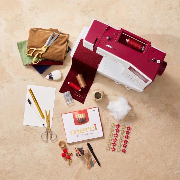 Nun kann das Bäumchen mit der Füllwatte prall gefüllt werden. Klebe mit dem Doppeltape das untere Ende des merci Stäbchens in die Öffnung und nähe den Rest der Öffnung per Hand zu. Jetzt fehlt nur noch der Zahlenaufkleber und fertig ist Dein erstes „Türchen” in Bäumchenform.