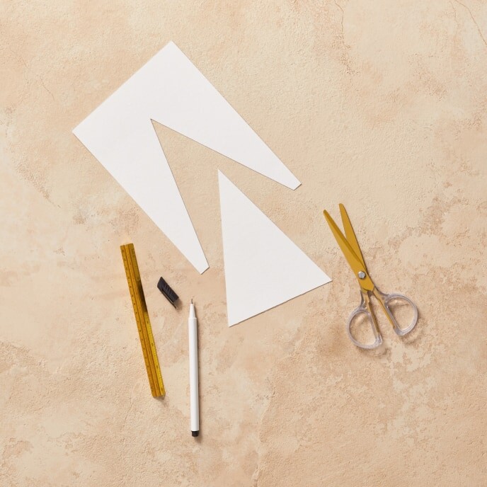 Zeichne ein Dreieck auf das Tonpapier und schneide es aus. Jetzt hast Du die Schablone für die Bäumchen.