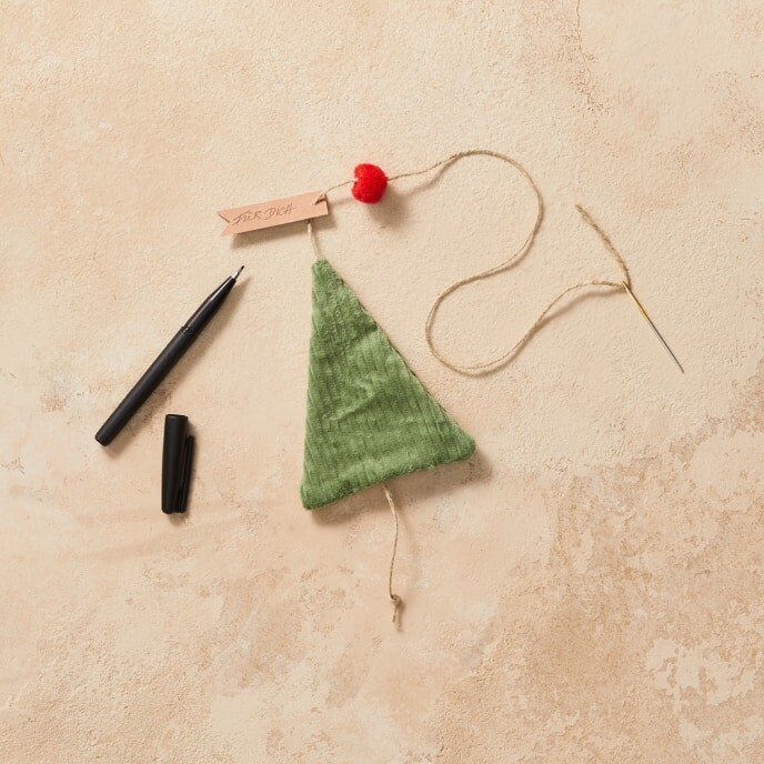 Jetzt kannst Du das Bäumchen auf rechts wenden und alle Ecken herausarbeiten. Anschliessend ist der Anhänger dran. Gehe dafür mit einer Wollnadel und einem Stück Kordel von innen durch die Spitze des Bäumchens. Verknote das innere Ende und fädle aussen noch einen beschrifteten Anhänger und ein Pompon (oder Glöckchen) auf.