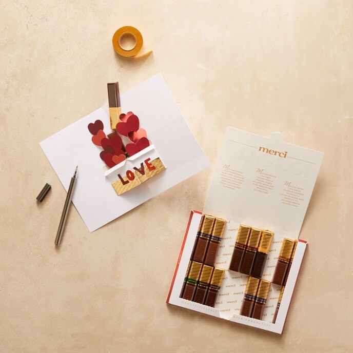 C’est bientôt fini: il ne vous reste plus qu’à coller quelques bâtonnets de chocolat merci derrière les cœurs avec du ruban adhésif double face. Astuce: remplacez le mot «Love» par le nom de l’élu·e de votre cœur.