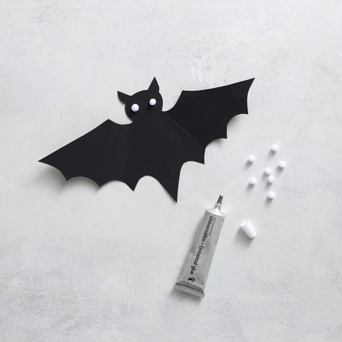 Fixez les minipompons avec de la colle universelle sur la tête de la chauve-souris pour figurer ses yeux.