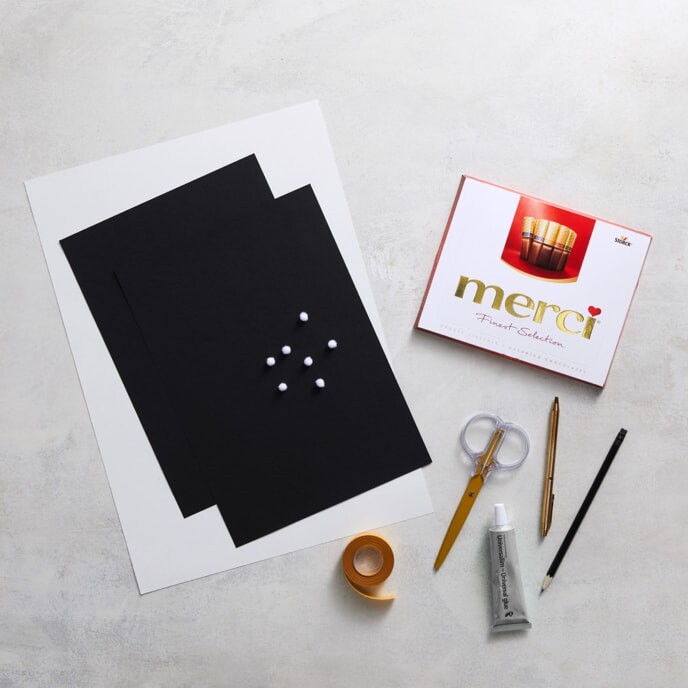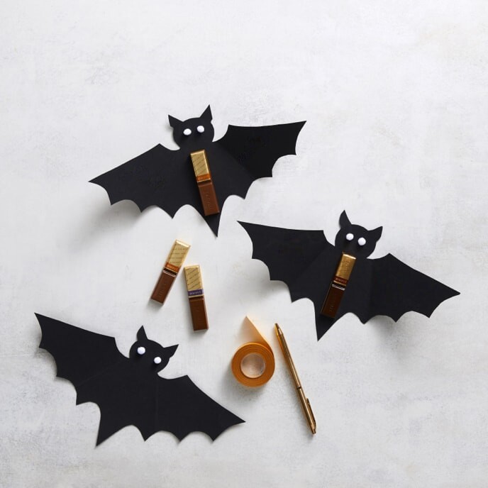 Écrivez sur les ailes le nom de votre invité·e et/ou un gentil message personnel avec le feutre fineliner et fixez le bâtonnet de chocolat merci au milieu du corps de la chauve-souris avec le ruban adhésif double face.