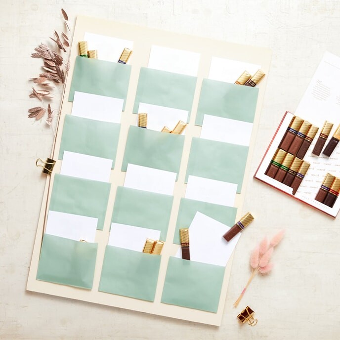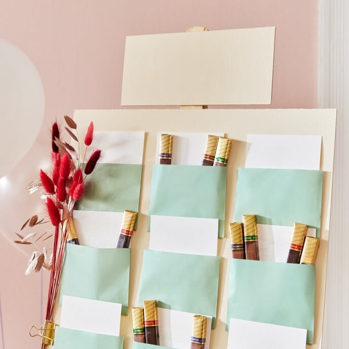 Attachez quelques fleurs séchées sur les bords du panneau avec les pinces double clip, puis glissez un ou deux chocolats merci dans chaque enveloppe. Et voilà!